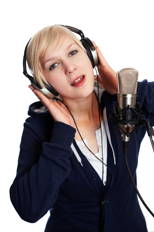 Woman singing a song in a silver studio microphone