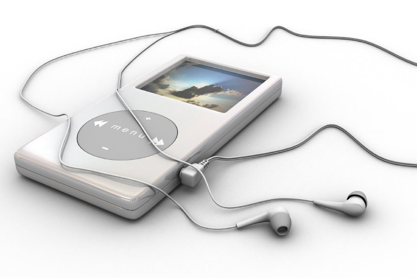 mp3 player with ear buds on white background