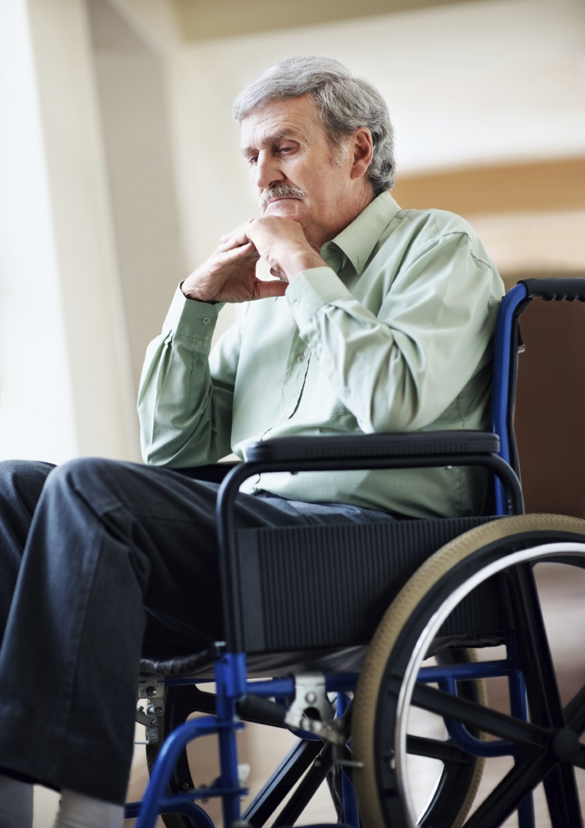 Thoughtful senior man sitting on a wheelchair in the hospital