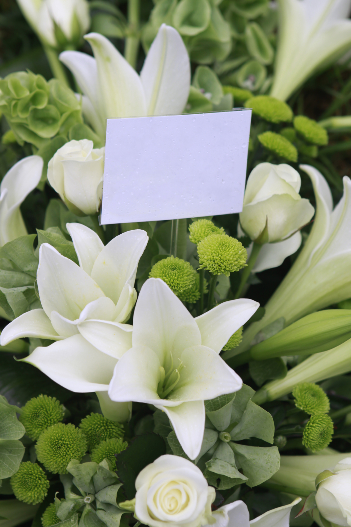 White lilies and white roses with bright green pompon Chrysanthemums with green foliage arranged into a funeral wreath. Blank card for your graphics and text.