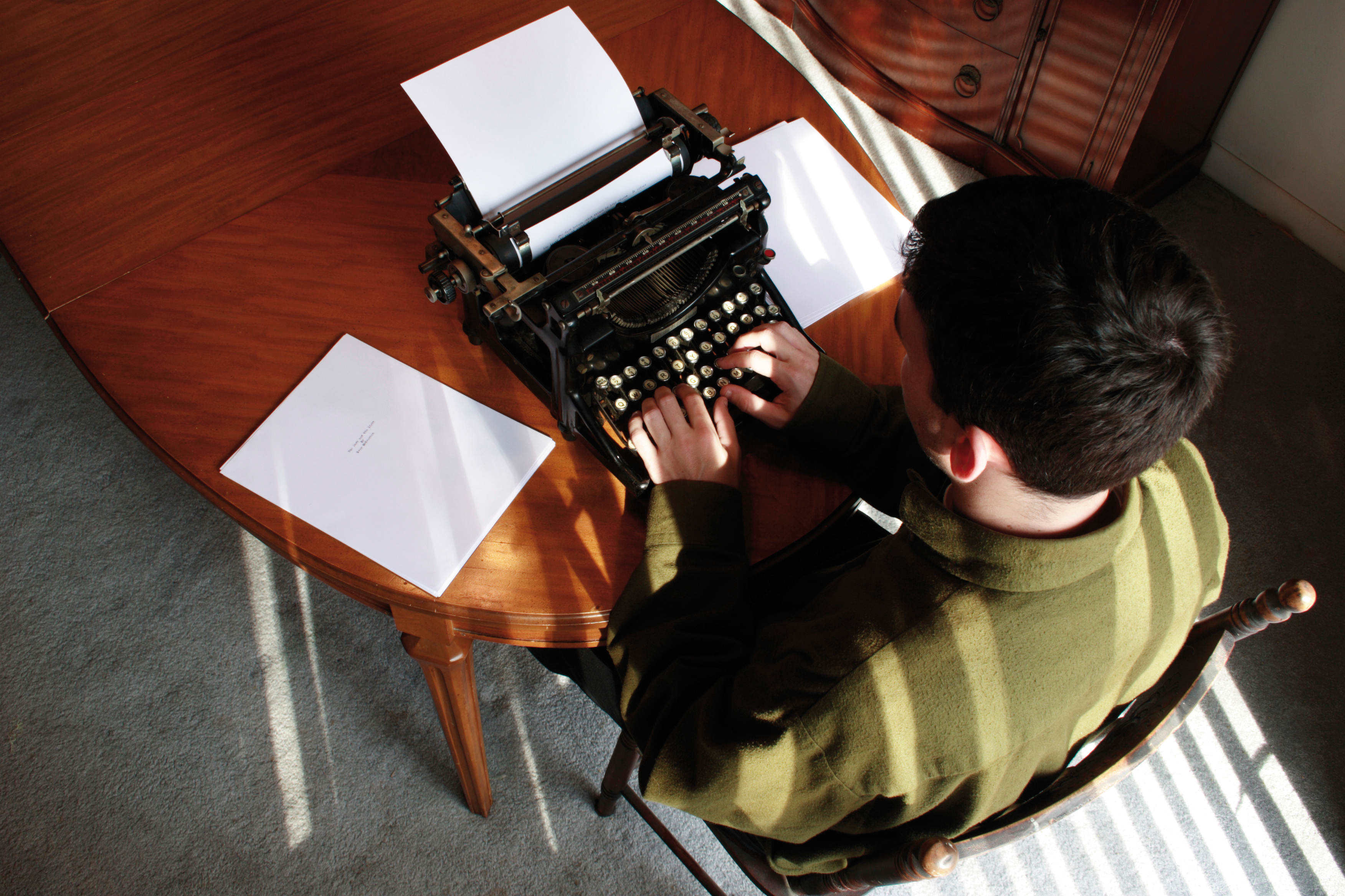 A man sits at a table writing a novel on an early 1900's vintage typewriter.