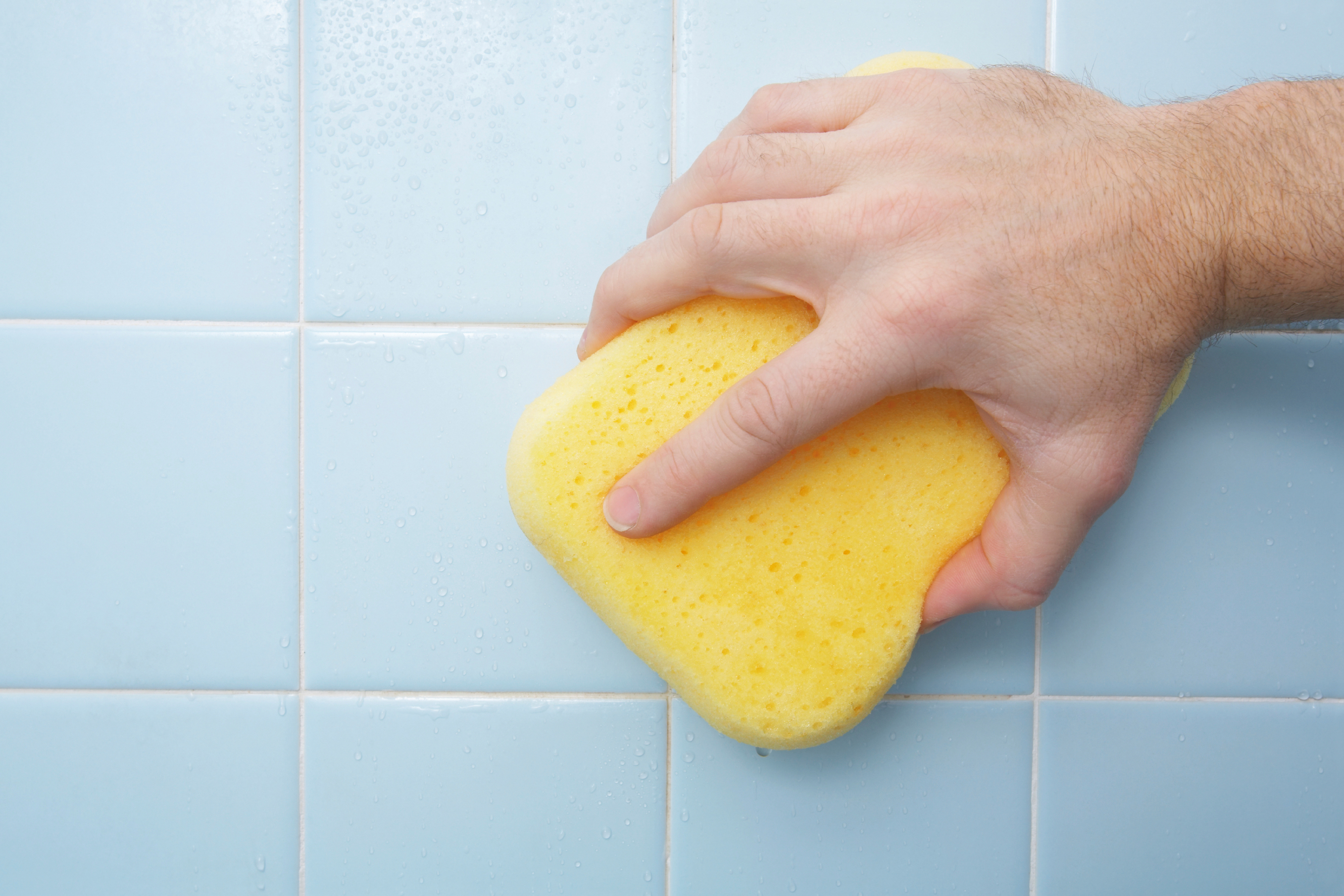 Hand scrubbing shower tiles with a sponge.