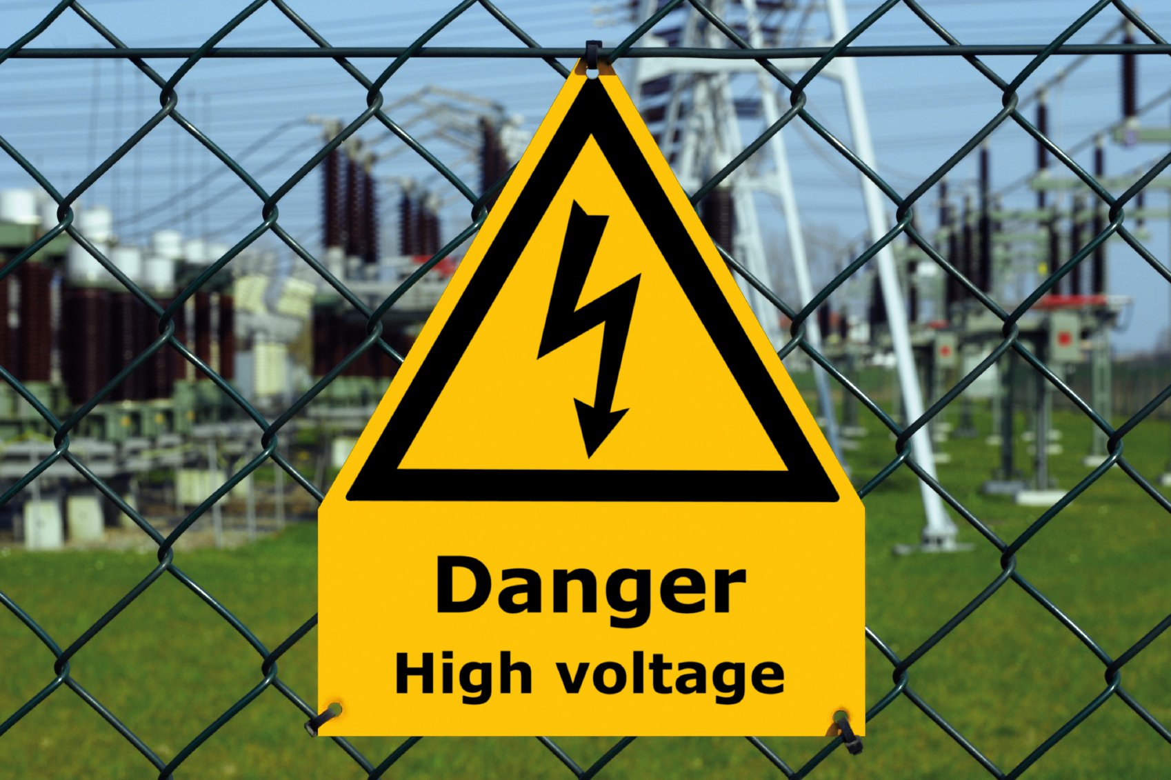 USA high voltage sign with substation, blue sky and green grass in the background.