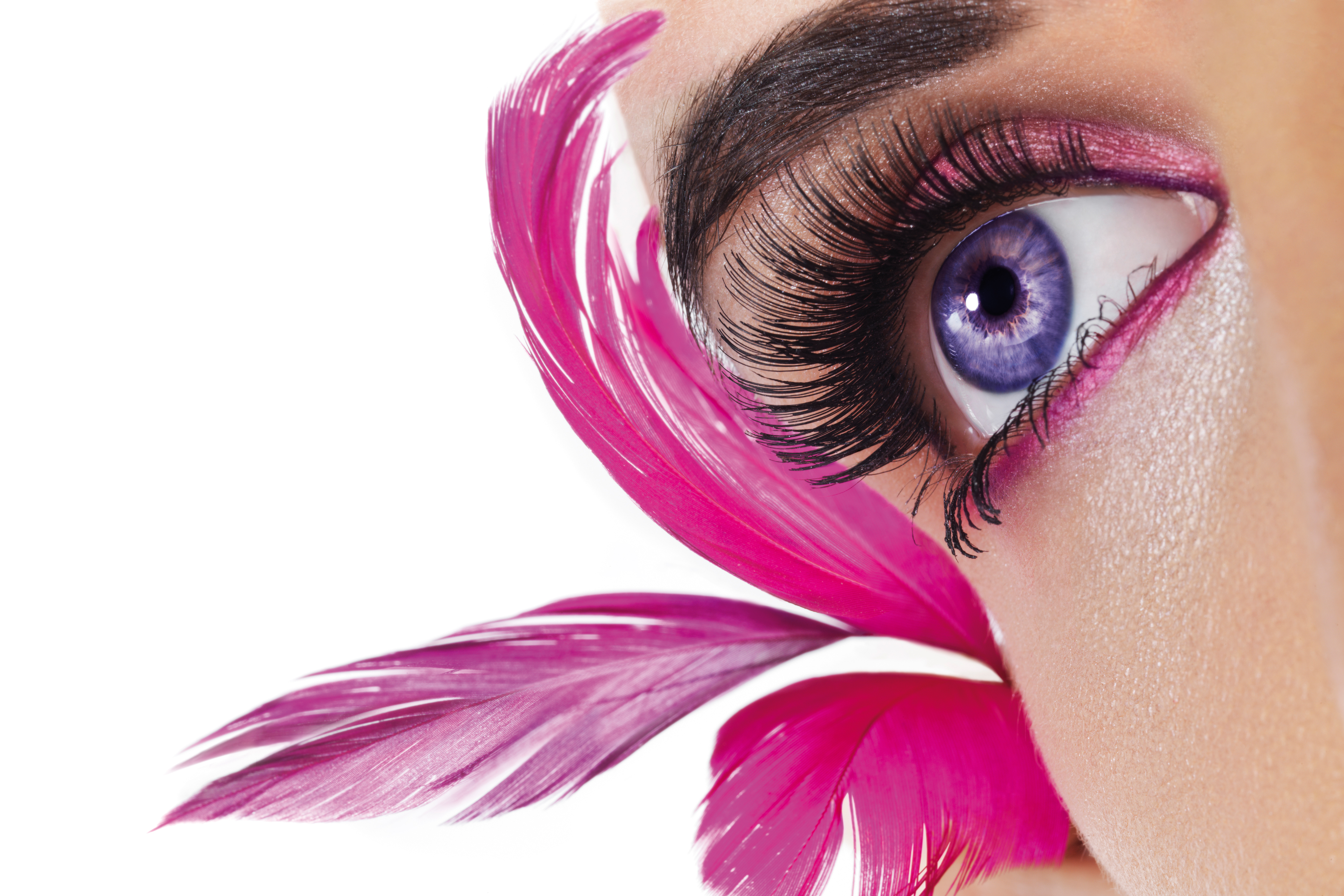 Beautiful woman`s open eye. Pink feathers on background.
