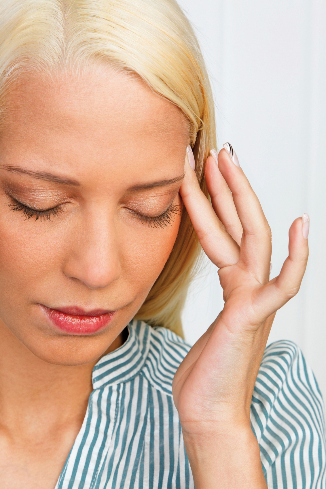 Junge Frau mit Stress bedingten Schmerzen im Kopf