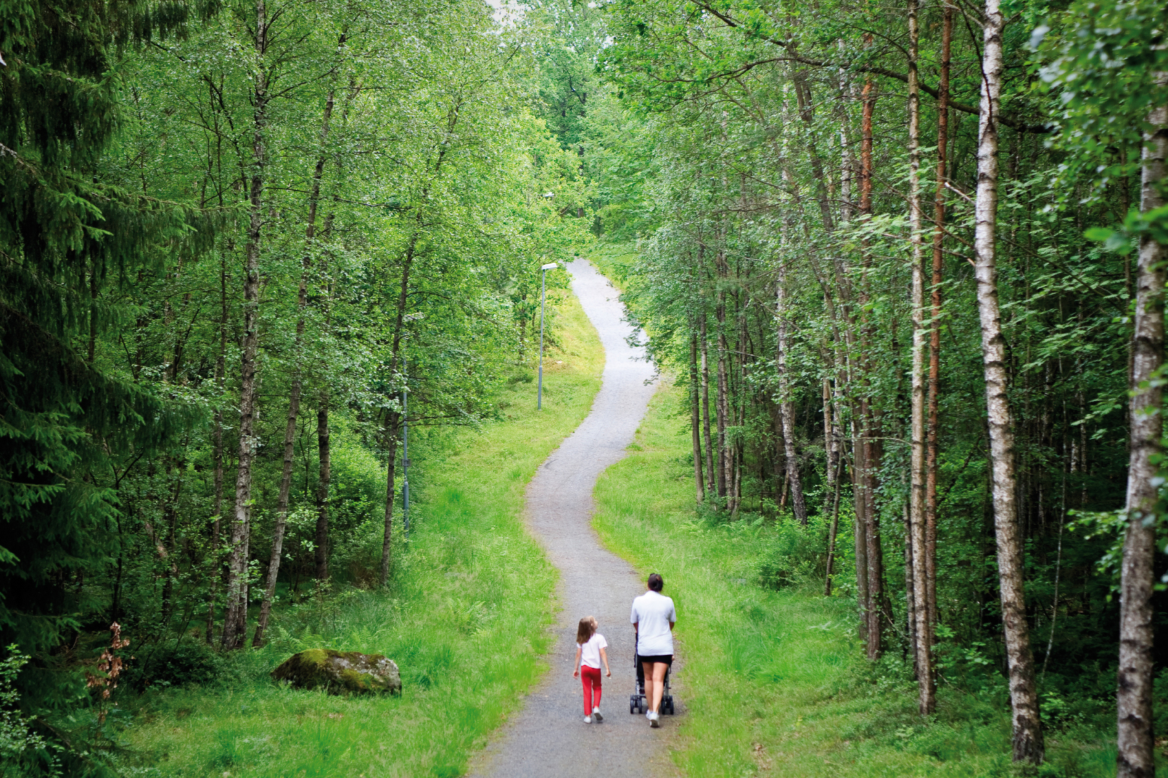 Mother and children walking an exercise trail through a forest