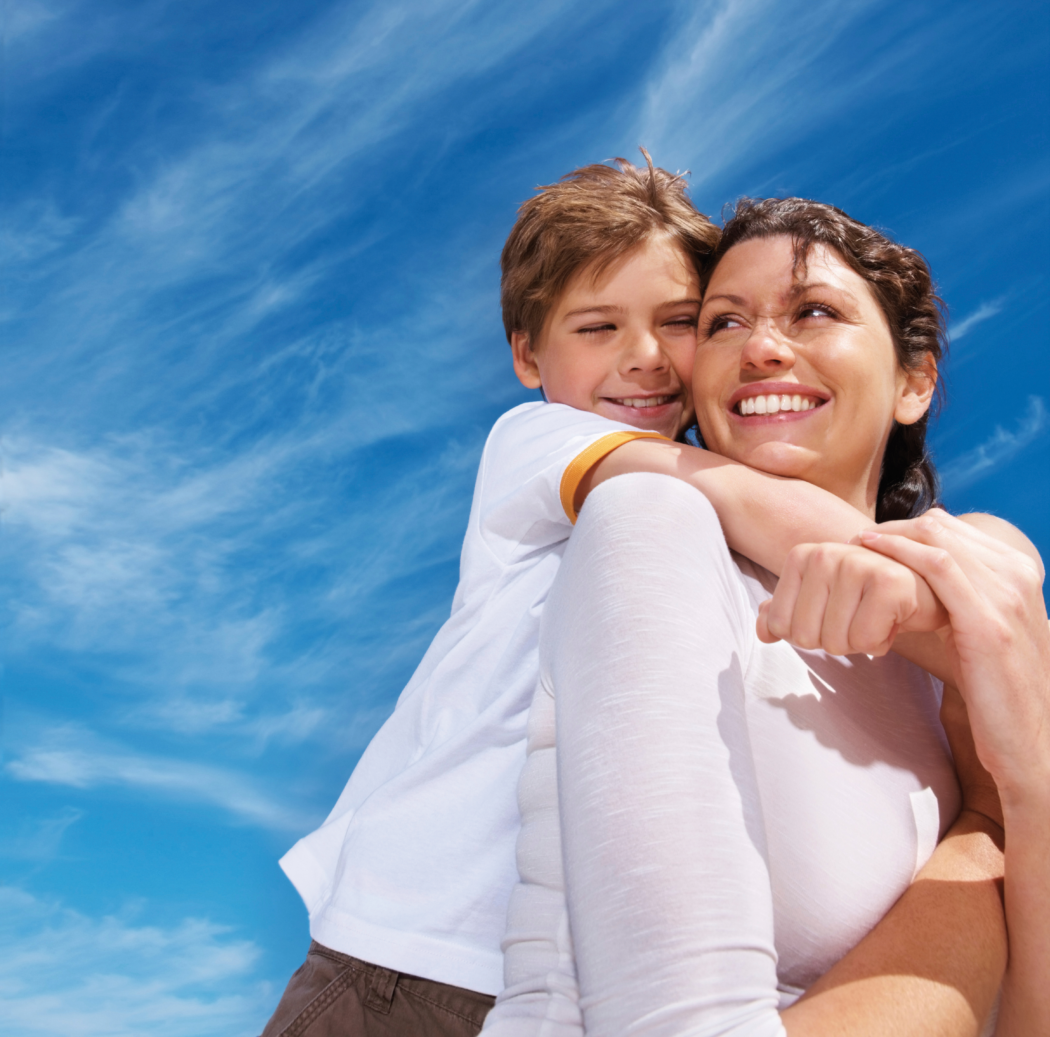 Happy young mother with son enjoying a piggyback ride against the clear blue sky