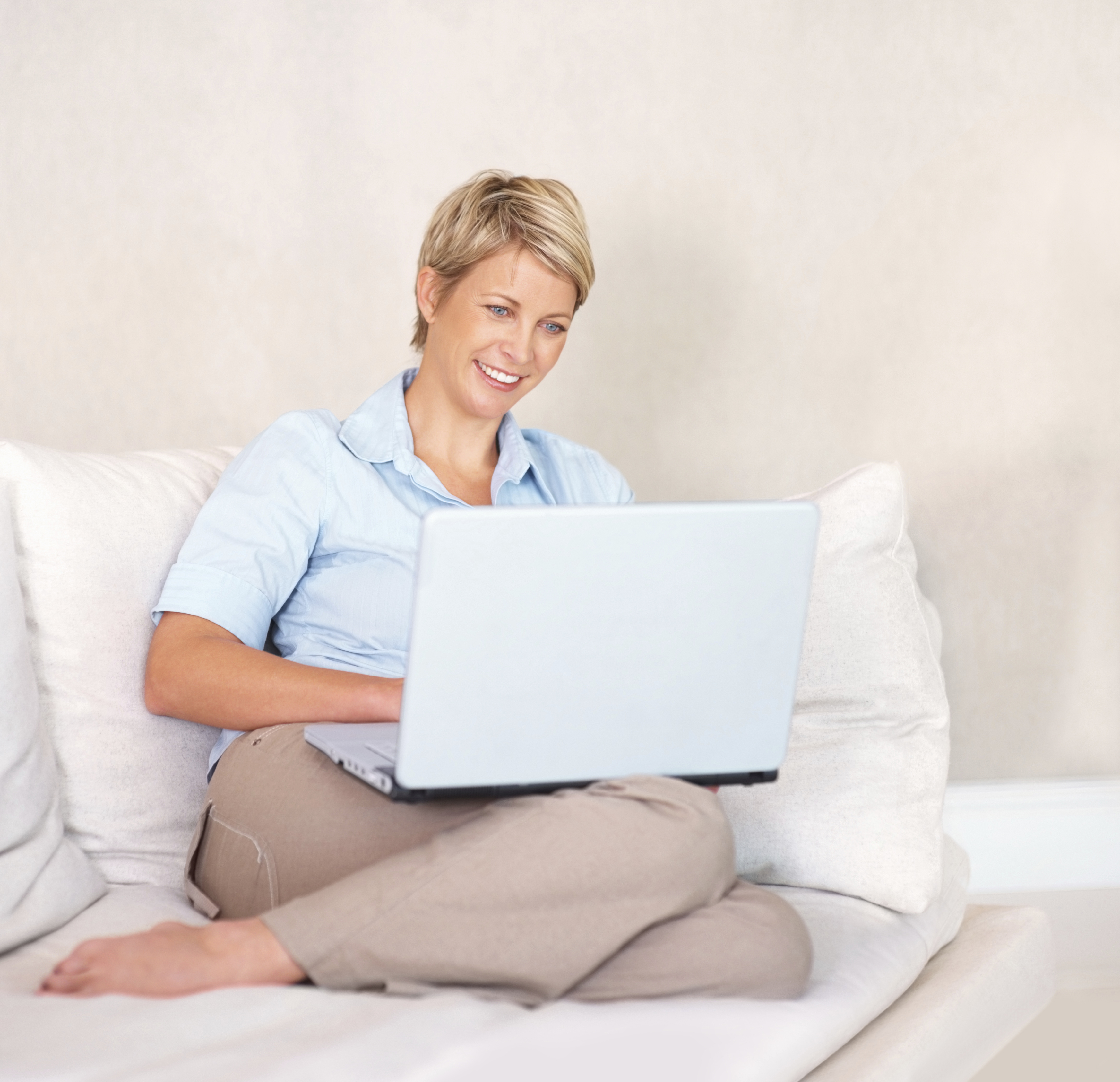 Happy middle aged woman using a laptop sitting relaxed on the couch