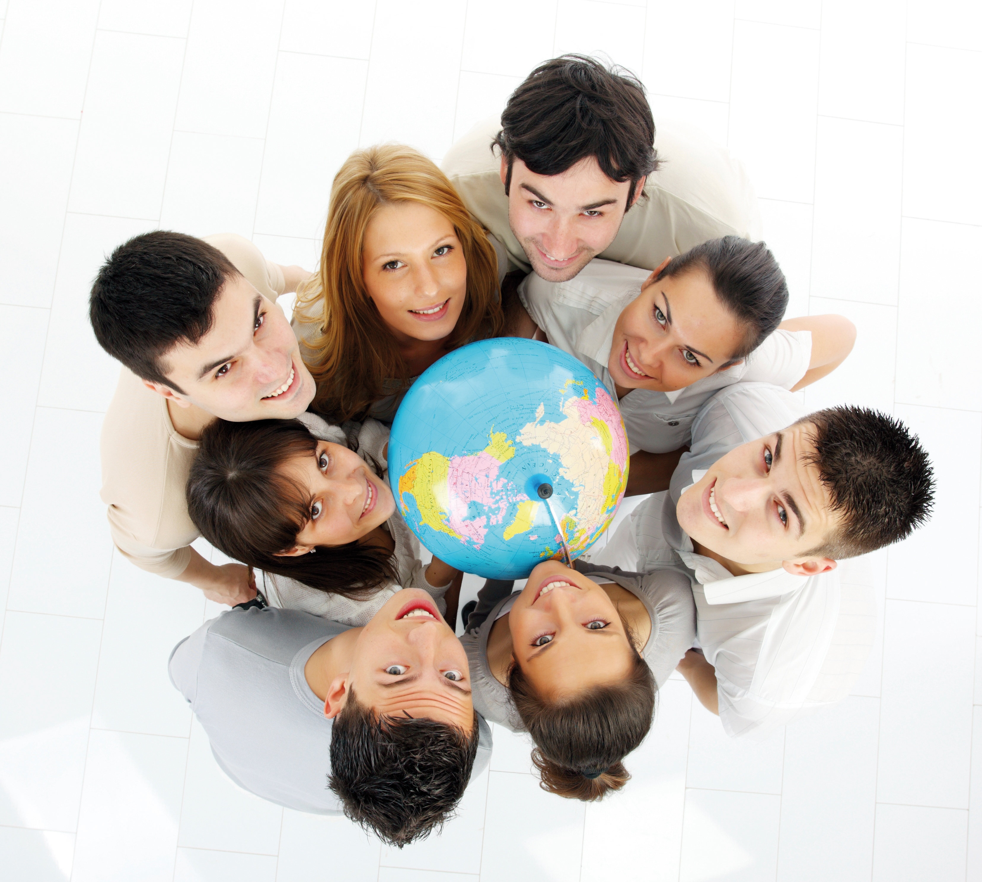 Group of a young students holding globe and looking at camera. View from above.