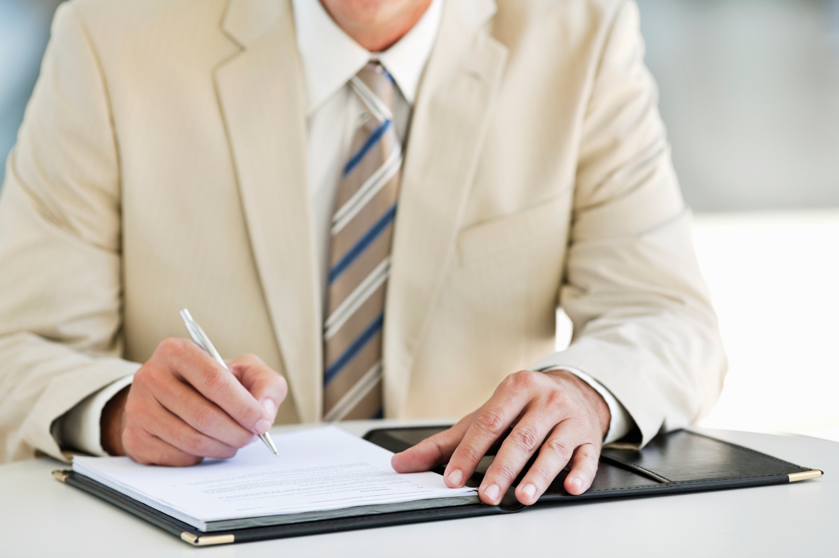 Cropped view of a businessman writing on a notepad in a binder. Horizontal shot.